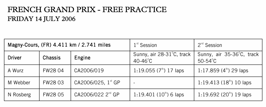 “Cosworth introduced the upgraded CA2006 Series 6 engine with Mark Webber in Magny-Cours and we encountered no performance, reliability or calibration concerns with either the new specification engine or the latest Petrobras fuel. Nico continued with his Series 4 engine from Indianapolis with no issues today, although, as reported, we are closely monitoring the condition of this engine. Alex also had no engine problems throughout his Friday programme.”