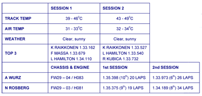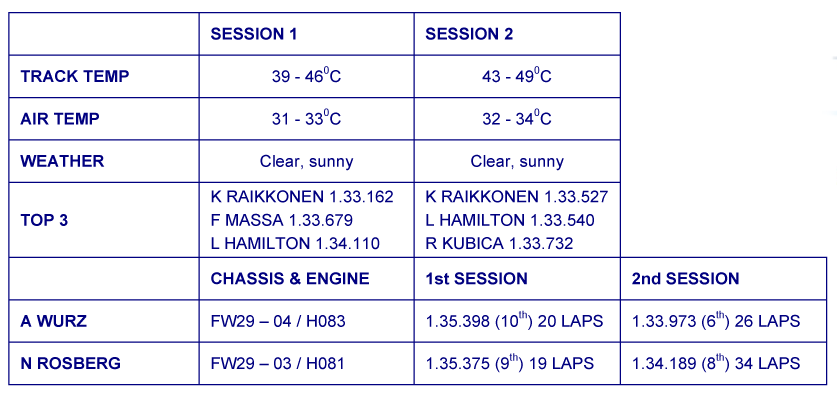 AT&T Williams have completed Friday’s free practice sessions for the last of the opening three flyaway races of the season, the Bahrain Grand Prix. With Kazuki Nakajima fulfilling his GP2 commitments, the team’s two race drivers carried out both practice sessions under hot conditions at the Sakhir circuit. In preparation for Sunday’s race, the pair concentrated on set-up work and long runs to ensure both cars tolerate what will undoubtedly be another hot Grand Prix. Over the two sessions, Alex and Nico covered a total of 535kms and set the sixth and eighth quickest time respectively of session two.